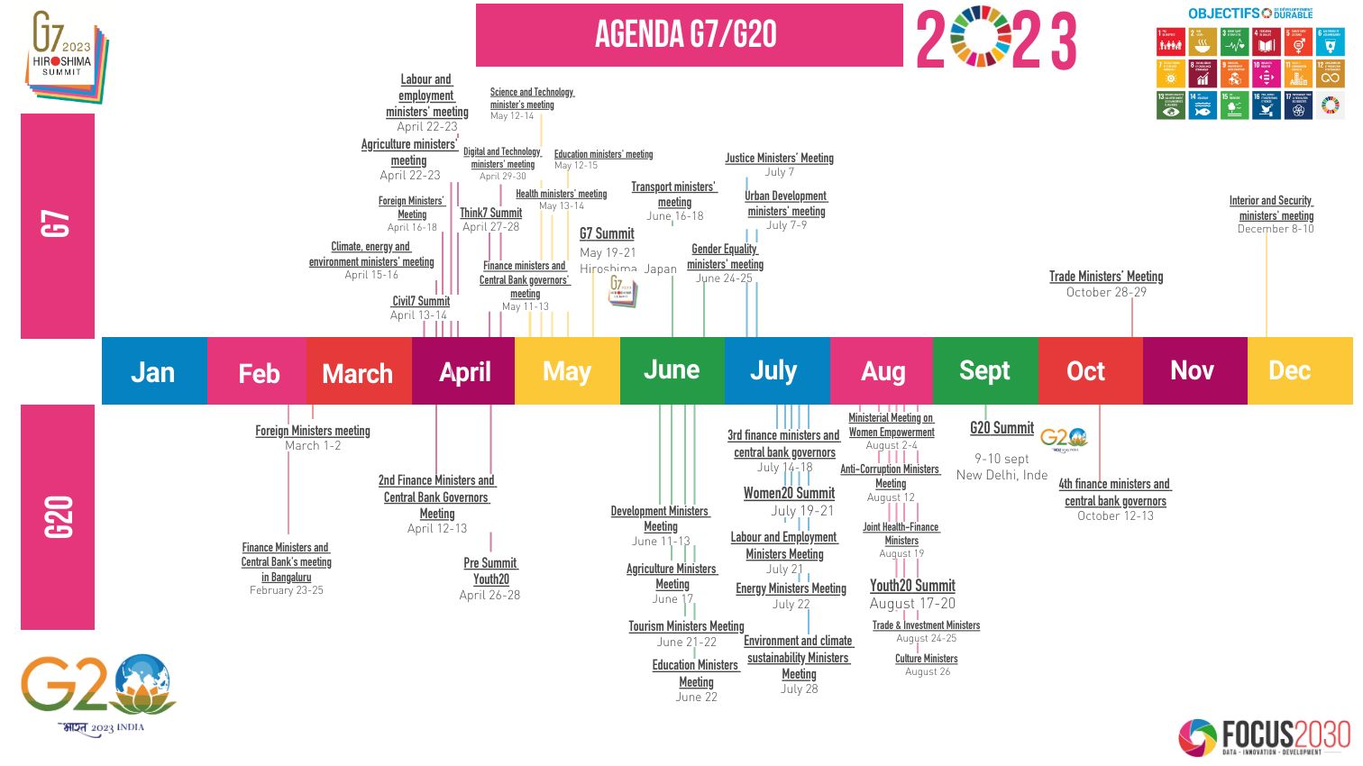 You will find below all the major events and ministerial meetings to be held in 2023 during the G7 Summit in Japan and the G20 Summit in India.