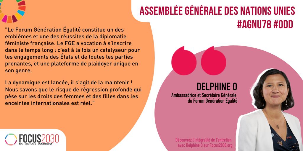 Delphine O : Le Forum Génération Egalité constitue un des emblèmes et une des réussites de la diplomatie féministe française. En 2021, nous avons beaucoup investi, humainement et financièrement, pour assurer le succès de cette conférence internationale attendue depuis un quart de siècle ! Mais le travail ne s’est pas arrêté depuis. Le FGE a vocation à s’inscrire dans le temps long : c’est à la fois un catalyseur pour les engagements des Etats et de toutes les parties prenantes, et une plateforme de plaidoyer unique en son genre. La dynamique politique et financière doit être maintenue pour que le Forum devienne un cadre de référence en matière d’égalité de genre, et de travail multi-acteurs. Pour la revue à mi-parcours, la France et le Mexique passent le flambeau à l’Islande et la Tanzanie, ce qui prouve l’attractivité du concept et son succès au Nord comme au Sud. Nous restons pour notre part engagés pour porter la « marque FGE » dans toutes les enceintes multilatérales et bilatérales, et pour accompagner la redevabilité.