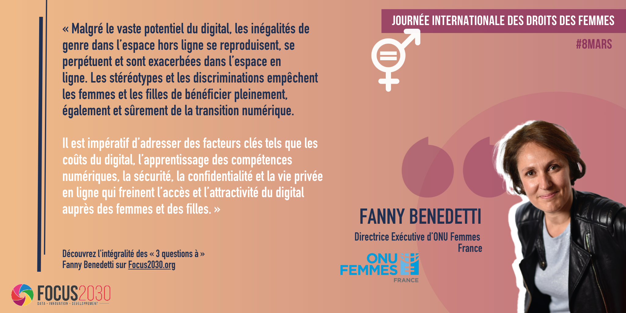 Fanny Benedetti : Malgré le vaste potentiel du digital, les inégalités de genre dans l’espace hors ligne se reproduisent, se perpétuent et sont exacerbées dans l’espace en ligne. Les normes discriminatoires empêchent les femmes et les filles de bénéficier pleinement, également et sûrement de la transition numérique. Il est impératif d’adresser des facteurs clés tels que l’accès à l’électricité, les coûts du digital, l’apprentissage des compétences numériques, la sécurité, la confidentialité et la vie privée en ligne ou encore les stéréotypes de genre qui freinent l’accès et l’attractivité du digital auprès des femmes et des filles.