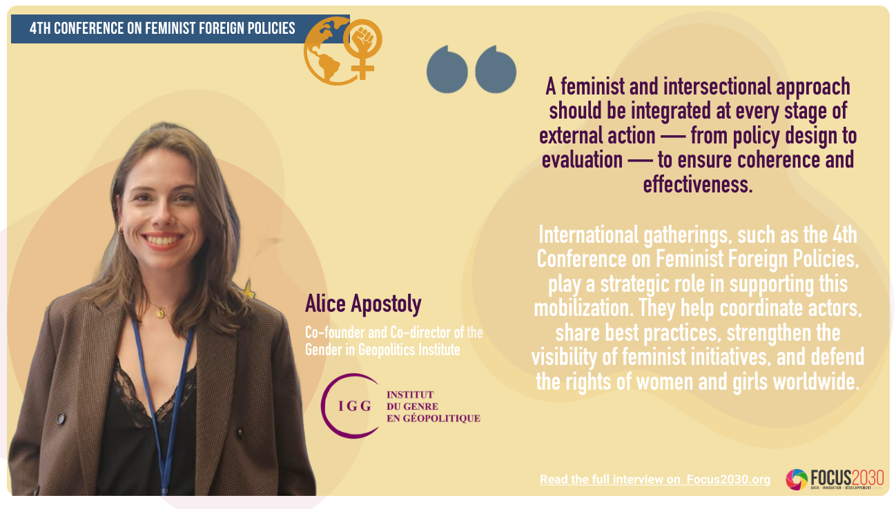 Alice Apostoly : Concretely, this would involve several transformations within European institutions and Member States. First, a feminist and intersectional approach should be integrated at every stage of external action — from policy design to evaluation — to ensure coherence and effectiveness. Second, coordination between national and European policies must be strenghtened to better support civil societies and marginalized voices. Finally, the active engagement of institutions, Member States, and social movements is essential to implement this policy in an inclusive and sustainable way.