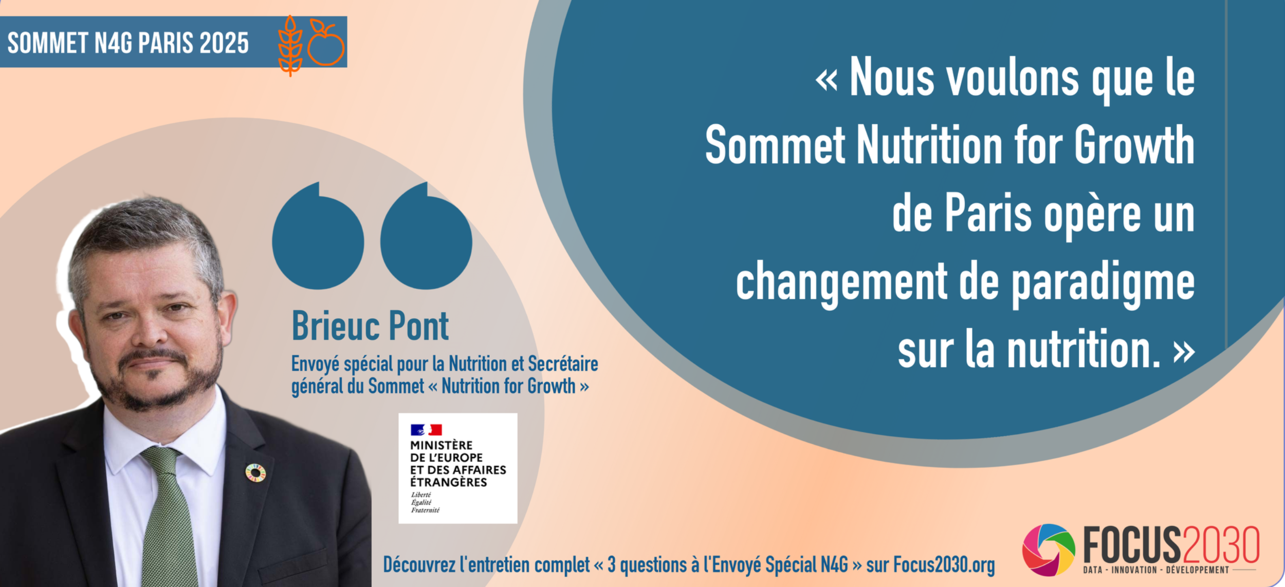 Brieuc Pont, Envoyé Spécial N4G : Nous voulons que N4G Paris soit un sommet qui opère un changement de paradigme sur la nutrition. Il s’agit de mieux ancrer les politiques de nutrition dans l’agenda de développement, mais aussi de considérer l’ensemble des formes de malnutrition, y compris le surpoids et l’obésité.