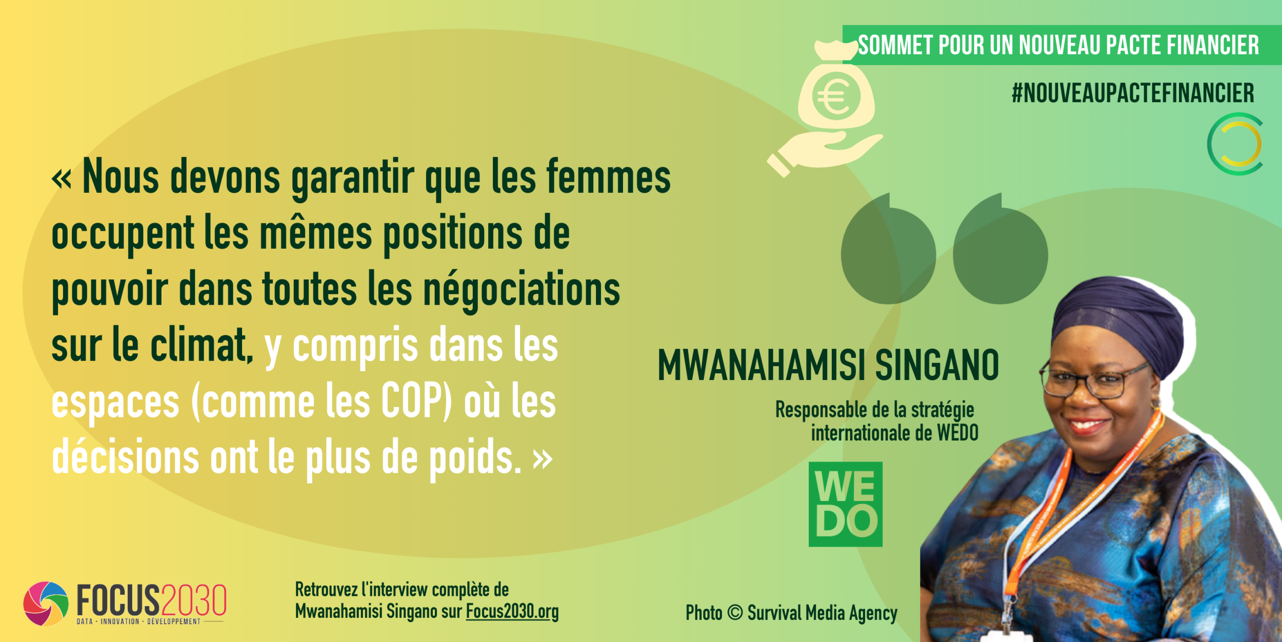 Focus 2030 : WEDO a contribué à inscrire dans l’accord de Paris, lors de la COP21 en 2015, des éléments de langage sur la spécificité de l’expérience des femmes face au changement climatique. Quels sont, selon vous, les meilleurs moyens de s’assurer que les voix des femmes sont prises en compte dans les espaces de décisions liées à l’environnement, au climat et au développement, et comment pouvons-nous nous assurer que ce soit le cas pendant le Sommet pour un nouveau pacte financier mondial ?