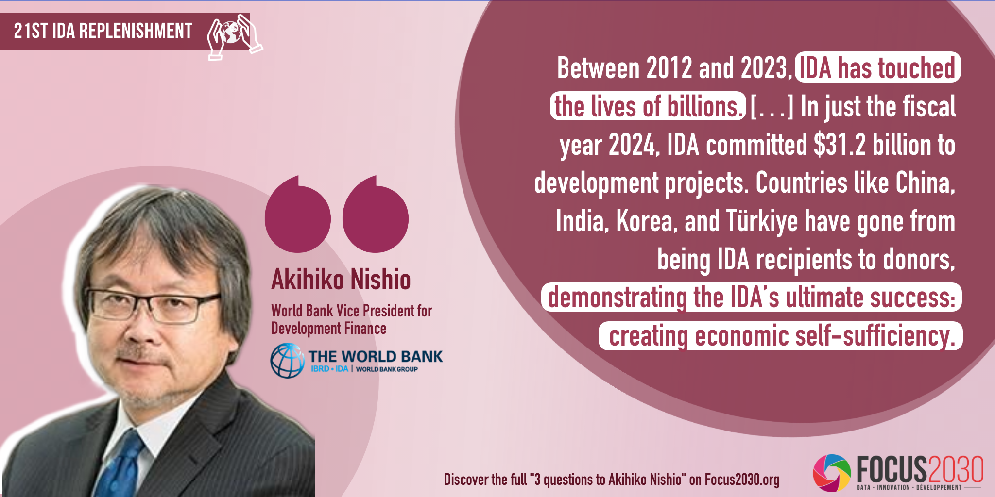 Akihiko Nishio : The International Development Association has been a remarkable story of transformation since its creation in 1960. Imagine an institution that both provides temporary relief, and helps countries build sustainable economic futures. That’s exactly what IDA has accomplished. Over the decades, 35 nations have graduated from being aid recipients to becoming donors themselves - a testament to IDA’s transformative impact.