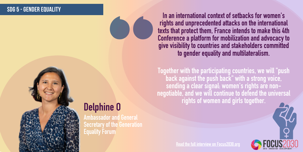 Focus 2030 : In 2019, France adopted a feminist foreign policy and has since launched several actions in favor of gender equality on the international stage, including co-organizing the Generation Equality Forum in 2021. Today, at least 15 countries have formally adopted a feminist foreign policy. Could you tell us what the main priorities of French feminist foreign policy are, and what concrete initiatives have been taken to promote women’s rights around the world ?