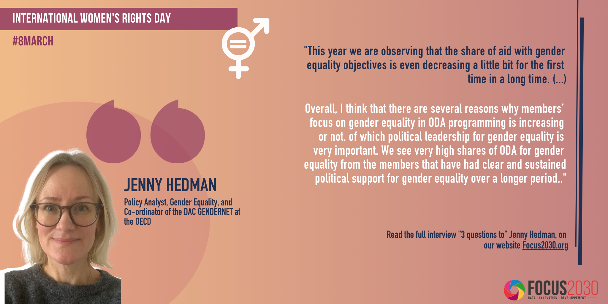 Jenny Hedman : This is indeed THE question, which also forms the basis for much of our work. This year we are observing that the share of aid with gender equality objectives is even decreasing a little bit for the first time in a long time. We hope that this is just a temporary dip, but will be exploring together with GenderNet members why this may be.