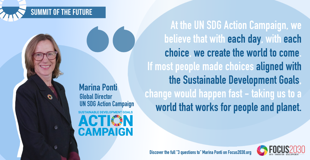 Marina Ponti : The UN SDG Action Campaign is mandated to engage, campaign and catalyze positive change towards the Sustainable Development Goals while advocating for rethinking, recalibrating and reimagining economies and societies so that they serve people and the planet. With a cross-cutting focus on fairness, inclusivity and justice, the Campaign advocates for the reform of the international financial architecture, human rights economy and beyond GDP, gender equality, climate action, sustainable food systems, peace, inclusive digital governance and other policy priorities.