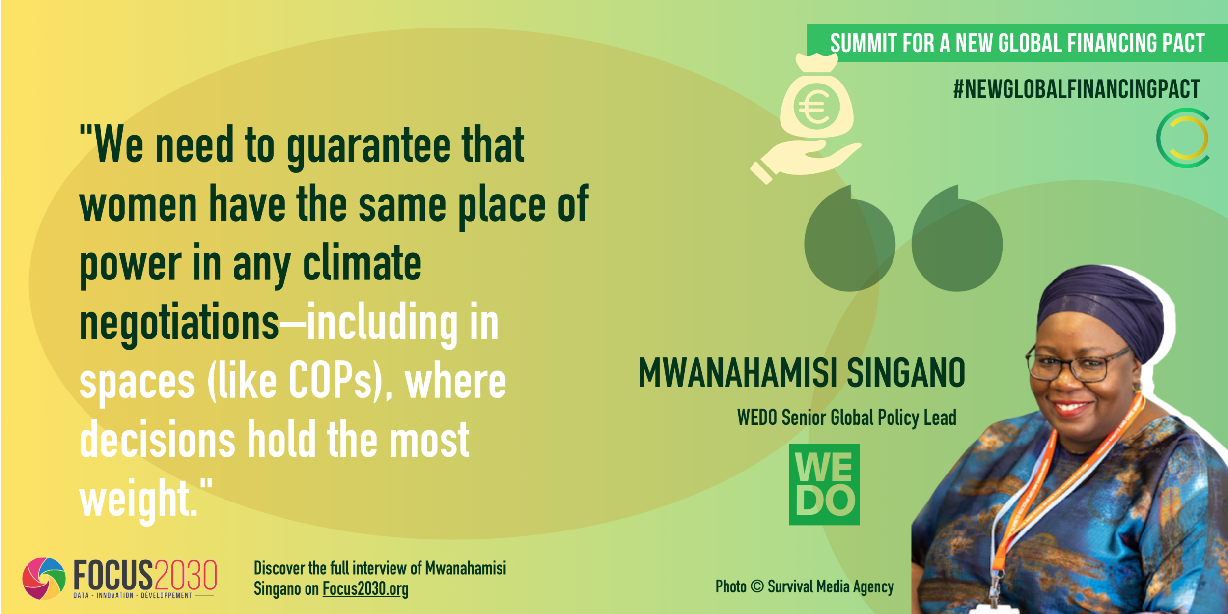 Focus 2030 : In your view, what actions should be taken to mobilize new financing for climate justice and gender equality on a global scale ? To what extent do you think the Bridgetown Initiative can contribute to progress on these issues ? How can this aspect of the Summit for a New Global Financing Pact contribute to the upcoming COP28 ?