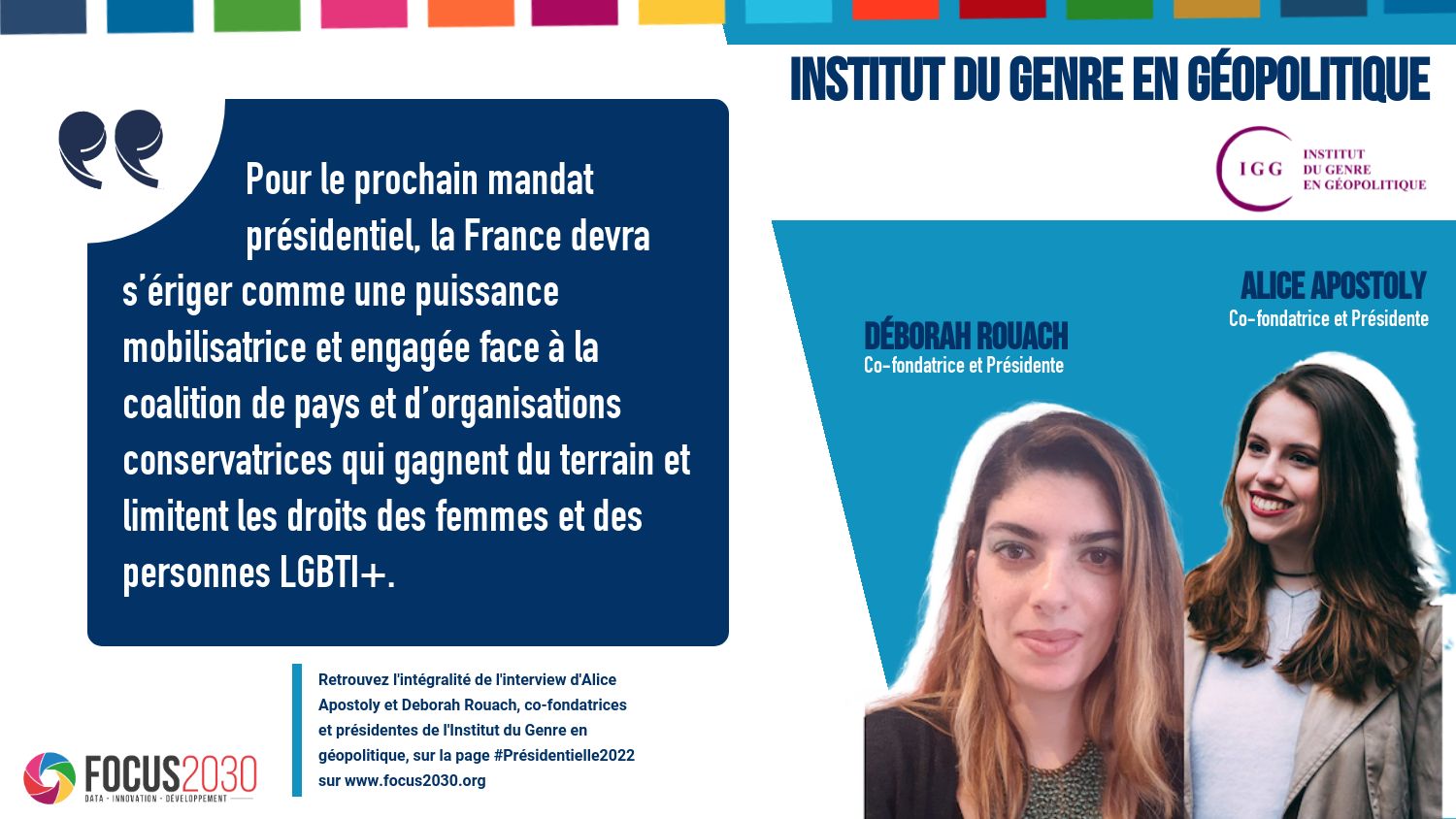 Alice Apostoly et Déborah Rouach : L’Institut du Genre en Géopolitique entend imposer le sujet des enjeux féministes, inclusifs, et internationaux au sein des débats présidentiels, et ce en portant un plaidoyer engagé. Nous sommes impliqués dans les activités de plaidoyer menées par le Collectif Générations Féministes, qui réunit plus d’une cinquantaine d’associations françaises aux identités variées. De notre côté, nous proposons des productions de recherche pour sensibiliser notre public sur des thématiques liées au genre et aux relations internationales à savoir la diplomatie féministe, les DSSR, les inégalités salariales, le rôle des femmes pour maintenir le fonctionnement de nos sociétés, des sujets qui doivent faire l’objet d’une attention particulière par les candidat·e·s à l’élection présidentielle.