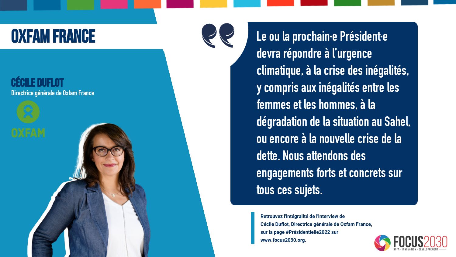 Cécile Duflot : Les défis sont nombreux et immenses. Le ou la prochain·e Président·e devra répondre à l’urgence climatique, qui est la menace majeure de notre siècle. Oxfam fait partie des organisations de l’Affaire du siècle qui a porté plainte contre l’État pour inaction climatique.