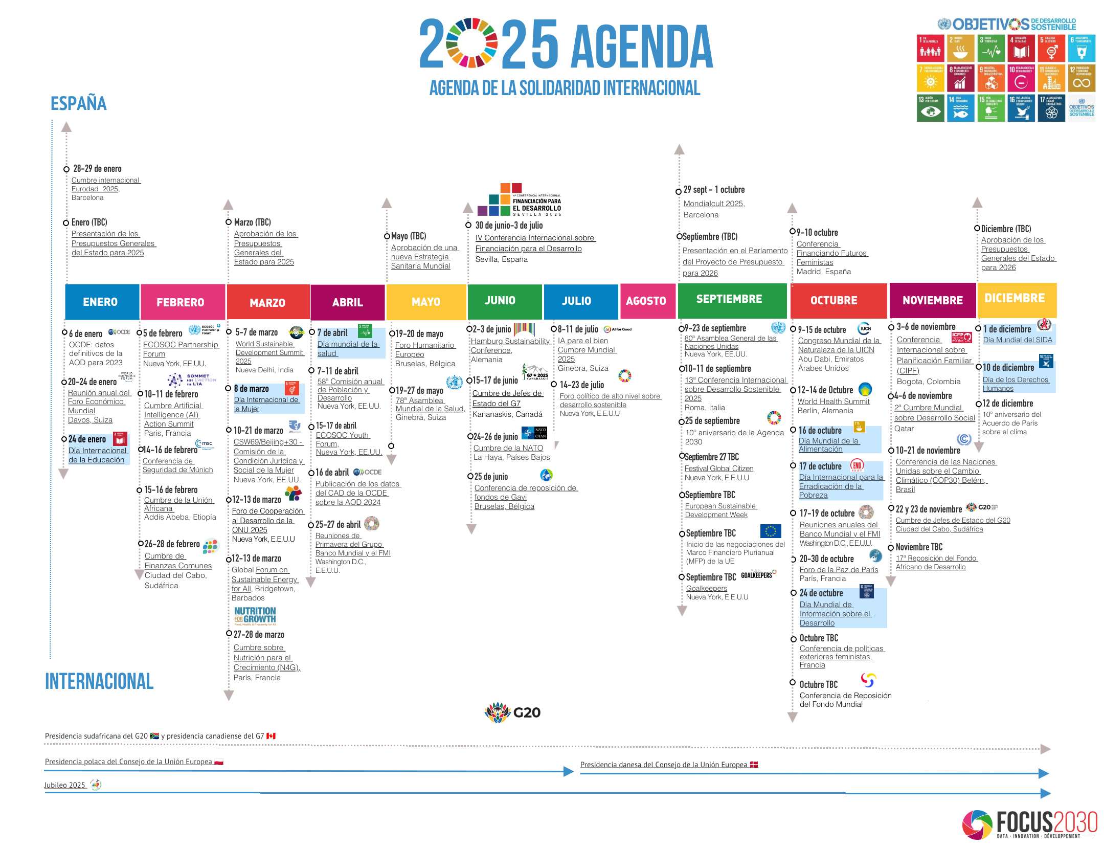 Este año se celebrarán, entre otras, la Cumbre sobre Nutrición para el Crecimiento (N4G), la Conferencia de las Naciones Unidas sobre los Océanos, la Cumbre Finance in Common, la 4ª Conferencia Internacional sobre la Financiación para el Desarrollo, las conferencias de reposición de fondos de Gavi, la Alianza para la Vacunación y del Fondo Mundial de Lucha contra el Sida, la Tuberculosis y la Malaria (GFATM), así como la COP30...