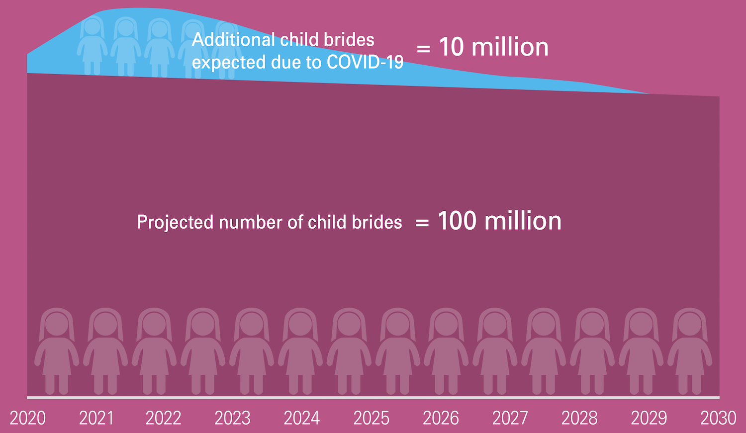 En mars 2021, l’UNICEF estimait que 10 millions de filles supplémentaires pourraient être mariées d’ici à 2030 du fait des conséquences directes et indirectes de la pandémie (décès parentaux, fermetures d’écoles, perturbation des services, hausse de la pauvreté, etc.).