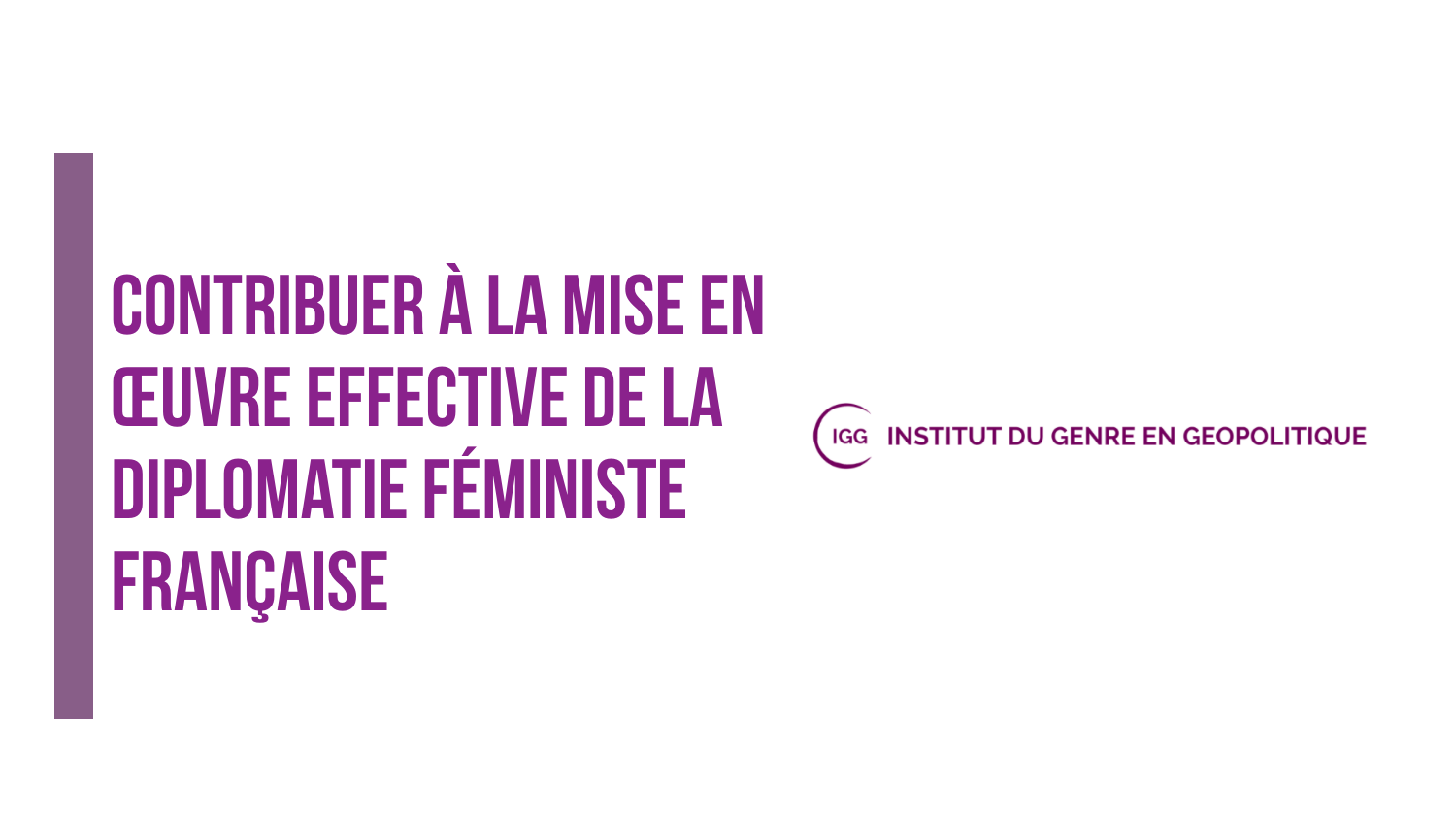 La France se veut le fer de lance dans la diffusion d’une diplomatie féministe dans les relations internationales, d’une part dans sa propre politique étrangère et d’autre part comme modèle pour d’autres pays. La nouvelle mandature doit encore renouveler les stratégies internationales de la France pour l’égalité entre les femmes et les hommes, ainsi que pour les enjeux de droits à la santé sexuels et reproductifs, alors que les enjeux de genre sont encore trop peu connus des décideur·e·s politiques. Alors que les enjeux d’égalité peinent encore à se faire une place au sein de l’hémicycle, tant la transversalité du genre est négligée dans les débats et que les affaires étrangères ne sont que peu discutées, l’IGG a l’ambition d’imposer la diplomatie féministe et les enjeux de genre au sein des débats politiques.