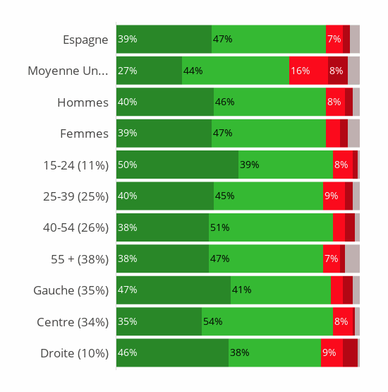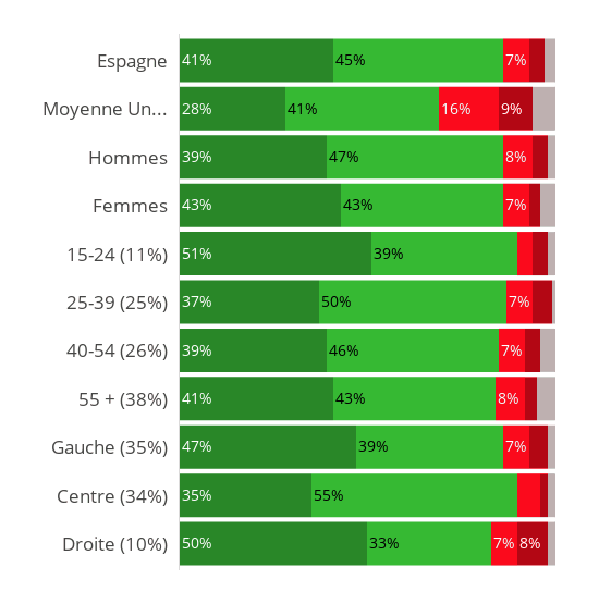 A nivel de la Unión Europea, el promedio de opiniones favorables alrededor de esta cuestión se eleva a un 69%, es decir 17 puntos porcentuales menos que en España.