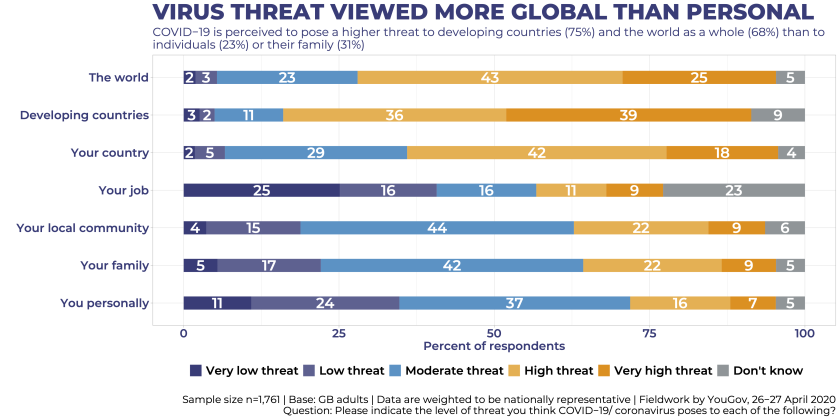 As the COVID-19 pandemic continues to rage around the world, 1761 people representative of the population of the United Kingdom were asked to assess the level of "threat" that the COVID-19 virus poses to them for themselves, their families, their local communities, their work, their country, for developing countries and the world.