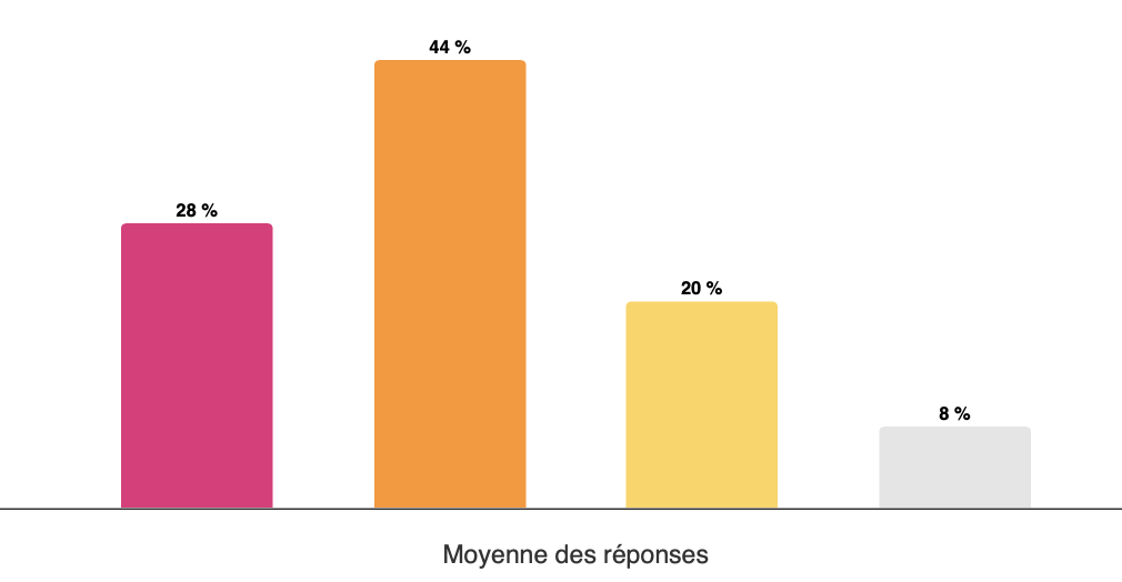 Pour les questions offrant une échelle de réponse de 0 à 10, les réponses sont présentées à partir du regroupement suivant : somme de 0 à 3 - somme de 4 à 6 - somme de 7 à 10.