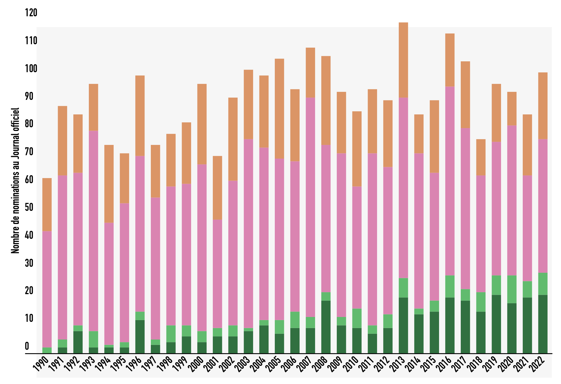 La volonté de renforcer la parité au sein du corps diplomatique français fait partie des priorités de la diplomatie féministe de la France : les femmes sont essentielles à la mise en œuvre de cette politique et leur nomination à des postes à haute responsabilité permet d’envoyer un message fort à l’international. La graphique ci-dessous représente l’évolution de leurs nominations en tant qu’ambassadrices et consules depuis 1990 :