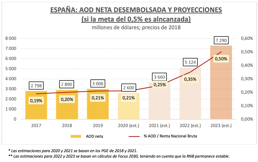 Según el nuevo presupuesto, la Ayuda Oficial para el Desarrollo (AOD) española alcanzará los 3.115 millones de euros (3.660 millones de dólares) o un 0.25% de la Renta Nacional Bruta (RNB) en 2021. Esto significa un incremento de 660 millones de dólares (+22%) comparado con la AOD neta desembolsada por España en 2019 según las últimas cifras publicadas por la Organización para la Cooperación y el Desarrollo Económico (OECD). Sin embargo, si comparamos esta cantidad con el presupuesto de ayuda de 2018, que continuó estando en vigor en 2019 y 2020, el aumento alcanza los 1.070 millones de dólares (+41%).