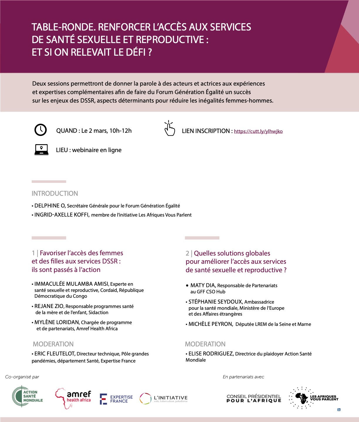 Objectif principal : Nourrir les réflexions menées par la France en tant que championne de la "Coalition d’action" DSSR en valorisant les bonnes pratiques et les initiatives de terrain à la fois innovantes et efficaces afin d’assurer un engagement politique et financier de la France qui soit ambitieux et adapté aux besoins du terrain en matière de santé maternelle et néonatale dans le cadre du Forum Génération Égalité.