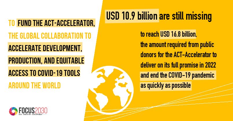 To ensure an equitable distribution of tests, treatments, vaccines, and protective equipment, ACT-A requires USD 23.4 billion by September 2022. Of this total budget, USD 16.8 billion are needed in public donor grants. As of October 2022, USD 10.9 billion are still missing.