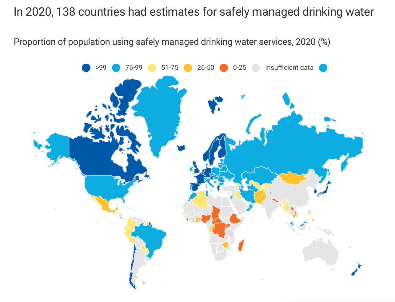 Source : WHO/UNICEF JMP (2021), Progress on household drinking water, sanitation and hygiene 2000-2020 : Five years into the SDGs. Visualisez la carte interactive sur le site de l’UNICEF.