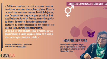 Morena Herrera, Présidente du Groupement citoyen pour la dépénalisation de l’avortement au Salvador, récompensé par le « Prix Simone Veil de la République française pour l’égalité femmes-hommes » a répondu à nos « 3 Questions à ».