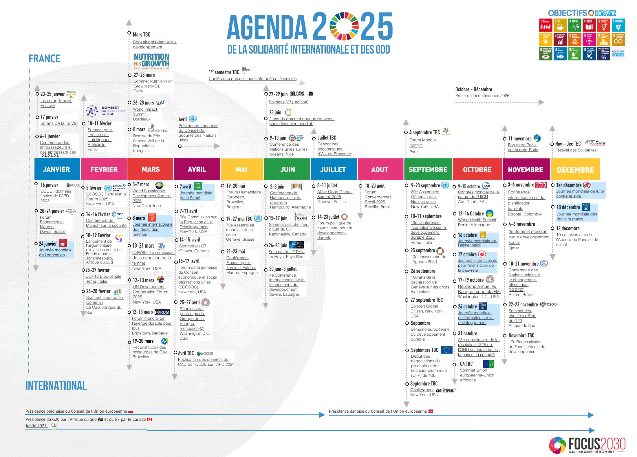 Cette année se tiendront, entre autres, le Sommet Nutrition for Growth (N4G), la Conférence des Nations unies sur les Océans, le Sommet Finance en Commun, la 4e Conférence internationale sur le financement du développement, les conférences de reconstitution des ressources de Gavi, l’Alliance du vaccin et du Fonds mondial de lutte contre le sida, la tuberculose et le paludisme (TBC) ainsi que la COP30...