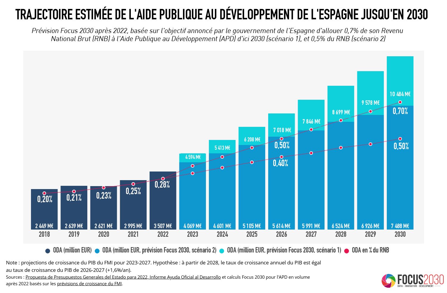 En effet, le projet de loi présenté par le gouvernement espagnol mentionne explicitement l’objectif de porter l’aide publique au développement (APD) de l’Espagne à 0,7 % du revenu national brut (RNB) du pays d’ici 2030. Étant donné que l’APD nette du pays devrait atteindre 4,4 milliards d’euros selon le budget général de l’État pour 2023, soit 0,34 % du RNB, atteindre l’objectif de 0,7 % au cours des huit années à venir se traduirait par une augmentation conséquente et sans précédent (6,2 milliards d’euros) de l’APD de l’Espagne entre 2022 et 2030, qui, à RNB constant, atteindrait environ 10,2 milliards d’euros.