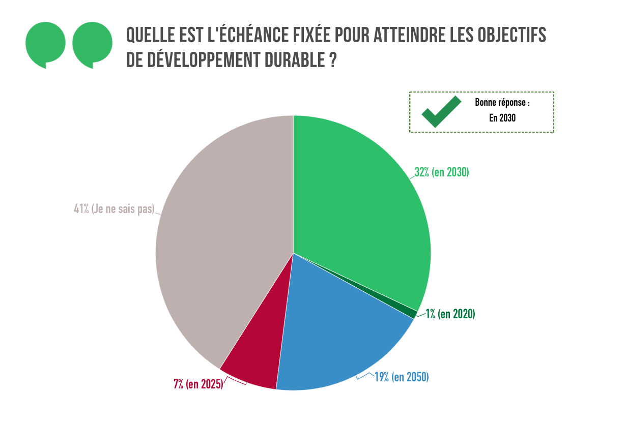 Les sympathisants du centre sont nettement plus nombreux (15%) que ceux de gauche (7%) ou de droite (5%) à avoir identifié (« 2030 »). Par ailleurs, le taux de bonne réponse à cette question relative à l’échéance de l’Agenda 2030 est réparti selon des proportions similaires au gré des discriminants socio-démographiques en termes d’âge ou de niveau d’études que dans les questions précédemment posées.