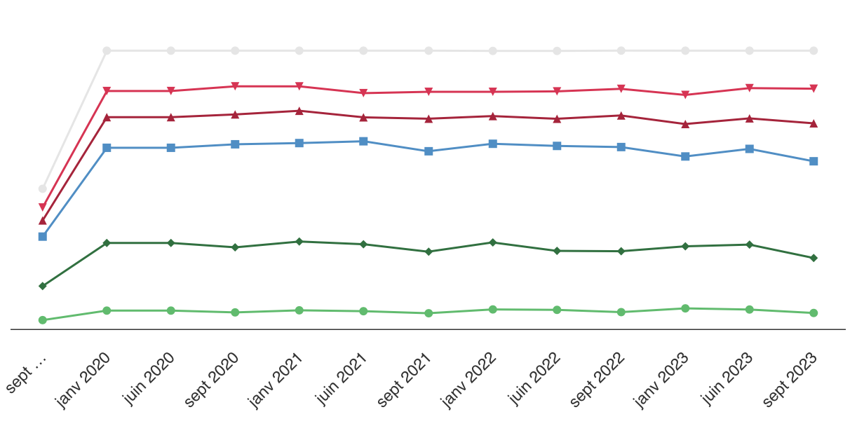 - Le Tracker : pour mesurer l’évolution des réponses dans les quatre pays de DEL (France, Royaume-Uni, Allemagne, États-Unis). 10 questions identiques sont posées trois fois par an pendant cinq ans à un échantillon d’environ 1000 répondant·e·s, et une fois par an à un échantillon d’environ 6000 répondant·e·s.