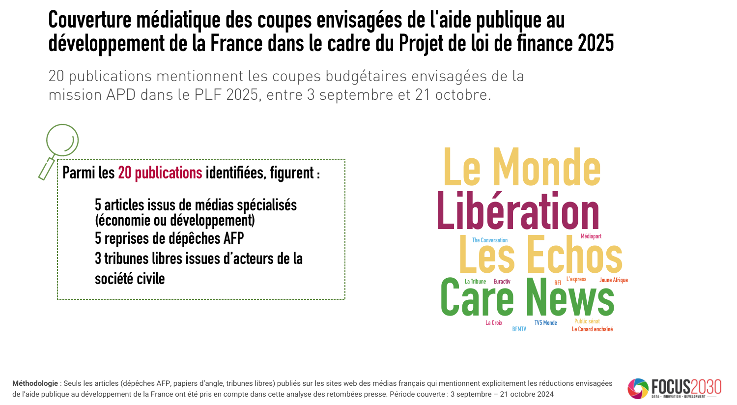 Sont ainsi analysées les couvertures par la presse des coupes envisagées dans le cadre du projet de loi de finances 2025, le Forum mondial pour la souveraineté et l’innovation vaccinales en 2024, la diminution des crédits alloués à l’aide publique au développement annoncée courant 2024, le lancement de la première campagne de vaccination systématique contre le paludisme, au Cameroun début de la même année, le dévoilement des montants alloués à l’aide publique au développement par les pays de l’OCDE (dont la France), l’adoption de la Loi sur le développement solidaire et la lutte contre les inégalités mondiales en 2021, le Forum Génération Égalité organisé à Paris la même année et la 6ème reconstitution du Fonds Mondial de lutte contre le sida, la tuberculose et le paludisme organisée à Lyon en 2019.