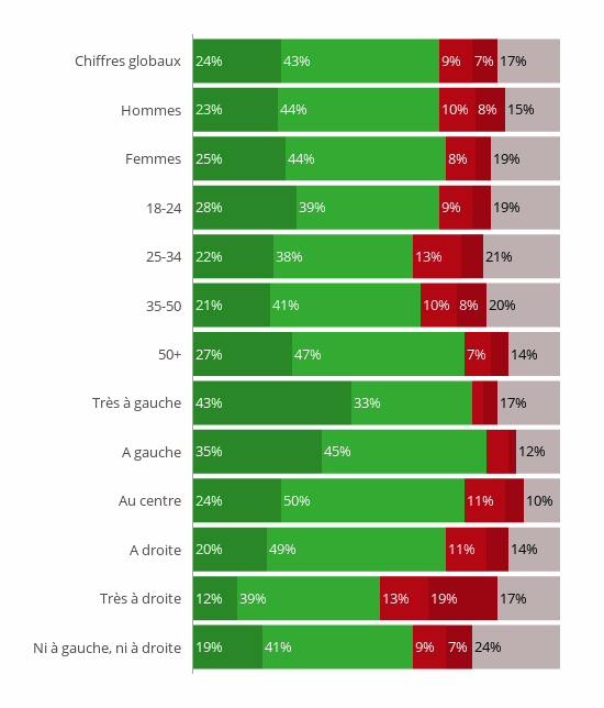 Ainsi, ce soutien s’observe tout particulièrement parmi les sympathisants de gauche et du centre (ayant voté pour Jean-Luc Mélenchon et Emmanuel Macron, respectivement, au premier tour de l’élection présidentielle de 2022).