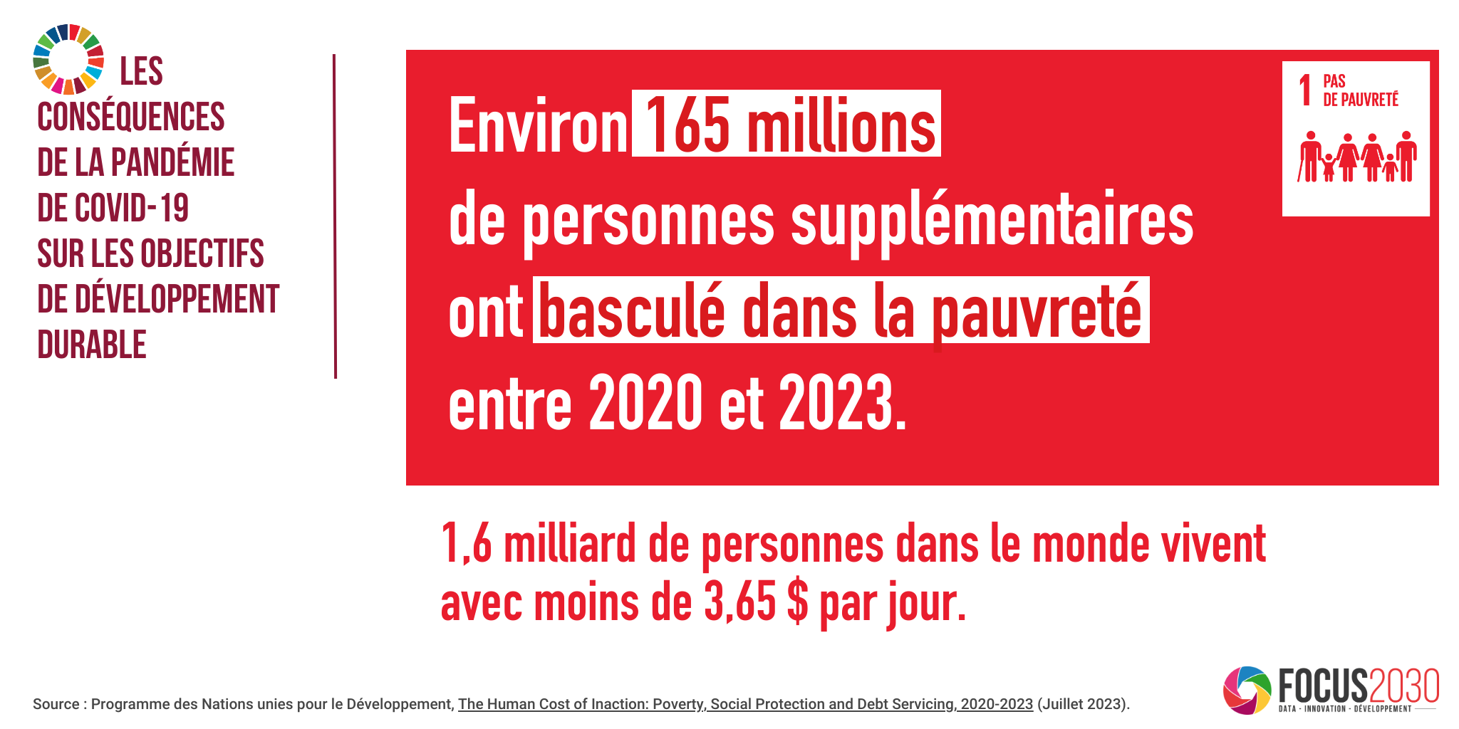 Le ralentissement de l’économie mondiale a ainsi entraîné la perte de 255 millions d’emplois, et a durement affecté les 1,6 milliards de personnes travaillant dans l’économie informelle (ODD 8), sans couverture sociale (ODD 1) ni sanitaire (ODD 3). La hausse de la pauvreté mondiale qui s’en est ensuivie (ODD 1) est sans précédent. Elle a causé une hausse de la faim (ODD 2), du travail des enfants (ODD 16), ou encore des inégalités entre les femmes et les hommes (ODD 5).