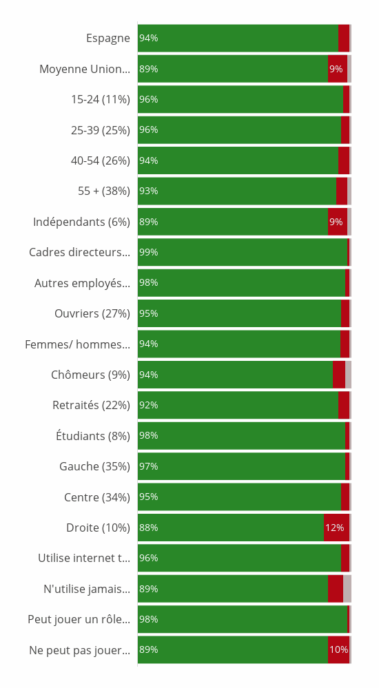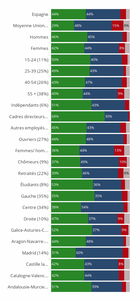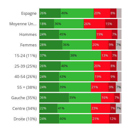 L’enquête est basée sur les réponses 27732 personnes couvrant les 28 pays et représentant la population adulte de chacun des pays, soit 1035 personnes en Espagne. Source : ec.europa.eu