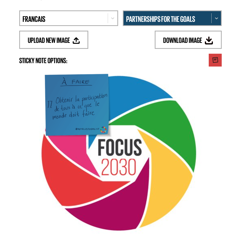 En collaboration avec Projet Everyone, nous vous proposons cet outil de génération d’images qui permet de placer facilement une note autocollante sur l’image de votre choix. N’hésitez pas à l’utiliser sur vos réseaux sociaux pour soutenir la réalisation des ODD et les faire connaître au plus grand nombre.