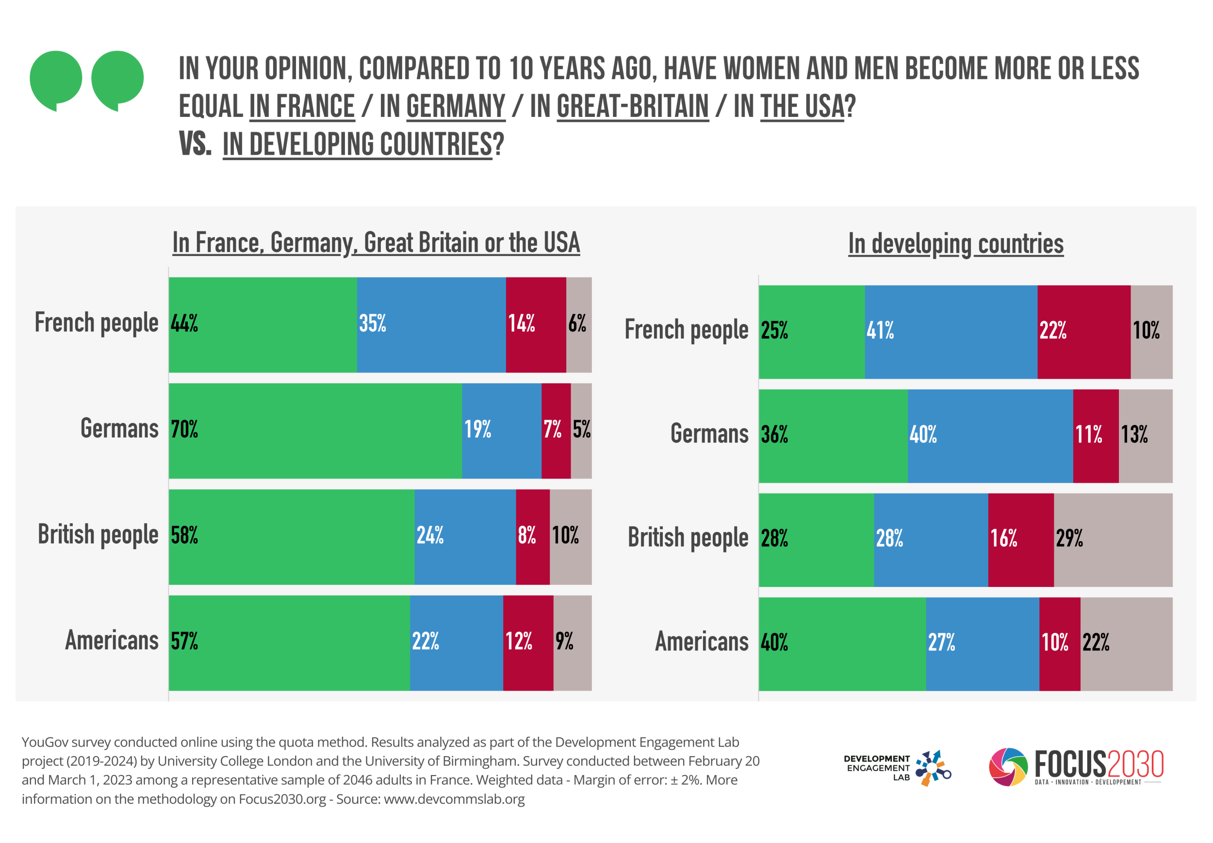This optimism seems less obvious when it comes to the situation in developing countries. In the three European countries surveyed (France, Germany, Great Britain), the proportion of respondents who believe that women and men are more equal than they were ten years ago is much lower in developing countries than their perception of the situation in their own country.