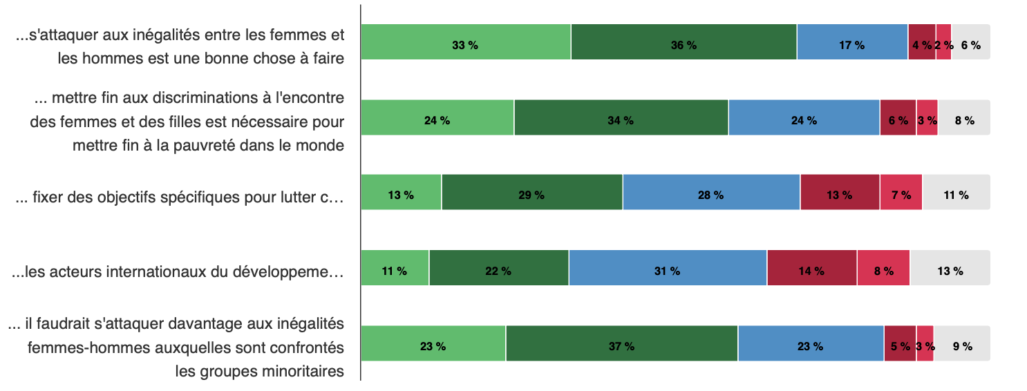 ...s'attaquer aux inégalités entre les femmes et les hommes est une bonne chose à faire ... mettre fin aux discriminations à l'encontre des femmes et des filles est nécessaire pour mettre fin à la pauvreté dans le monde ... fixer des objectifs spécifiques pour lutter contre la pauvreté des femmes et des filles ne permettrait pas beaucoup de réduire la pauvreté mondiale dans son ensemble ...les acteurs internationaux du développement ne devraient pas imposer leurs valeurs en matière d'égalité entre les femmes et les hommes aux pays en développement ... il faudrait s'attaquer davantage aux inégalités femmes-hommes auxquelles sont confrontés les groupes minoritaires Tout cocher /Tout décocher