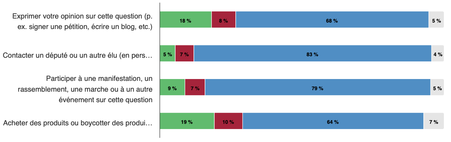 Exprimer votre opinion sur cette question (p. ex. signer une pétition, écrire un blog, etc.) Contacter un député ou un autre élu (en personne, par téléphone, par courrier ou par le biais de Twitter, Facebook ou d'un autre réseau social) Participer à une manifestation, un rassemblement, une marche ou à un autre événement sur cette question Acheter des produits ou boycotter des produits/services en rapport avec cette question (p. ex. acheter des produits dans la boutique d'une association caritative) Tout cocher /Tout décocher