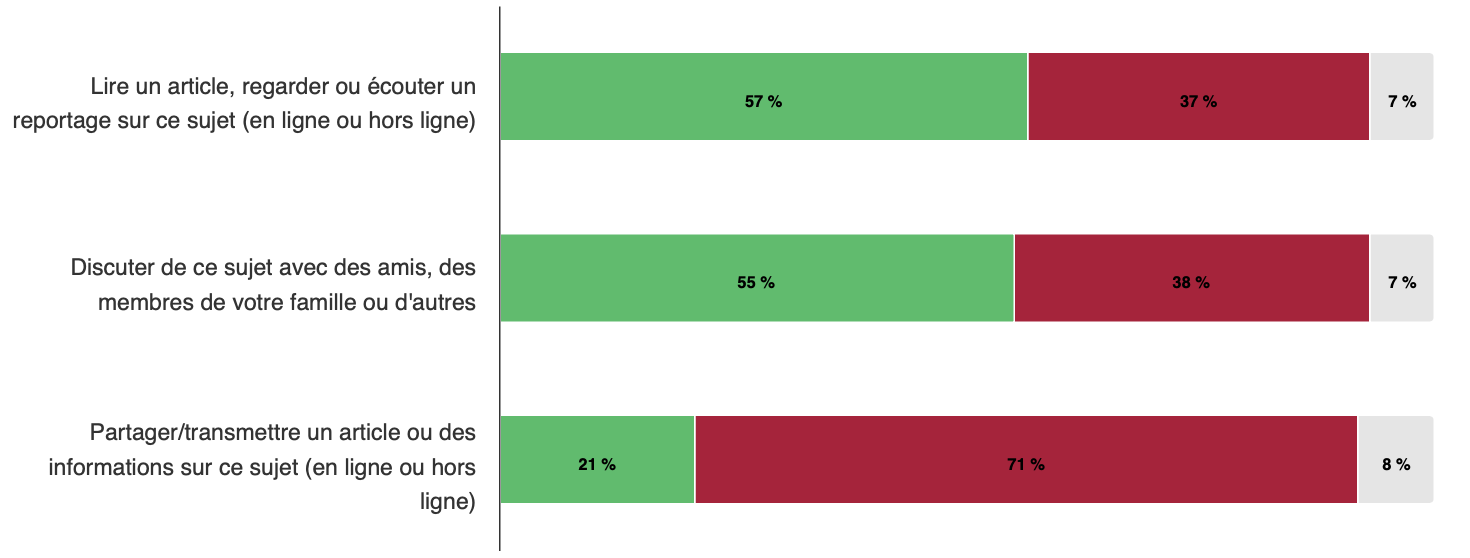 Lire un article, regarder ou écouter un reportage sur ce sujet (en ligne ou hors ligne) Discuter de ce sujet avec des amis, des membres de votre famille ou d'autres Partager/transmettre un article ou des informations sur ce sujet (en ligne ou hors ligne) Tout cocher /Tout décocher