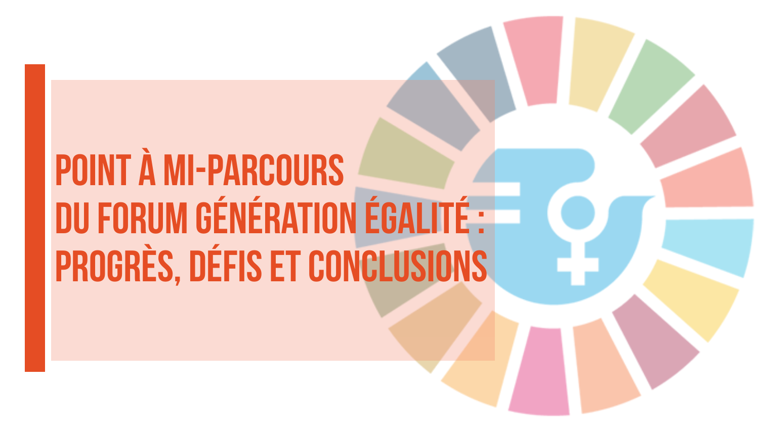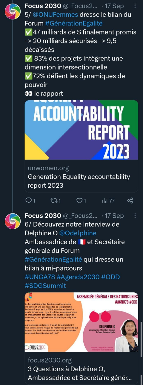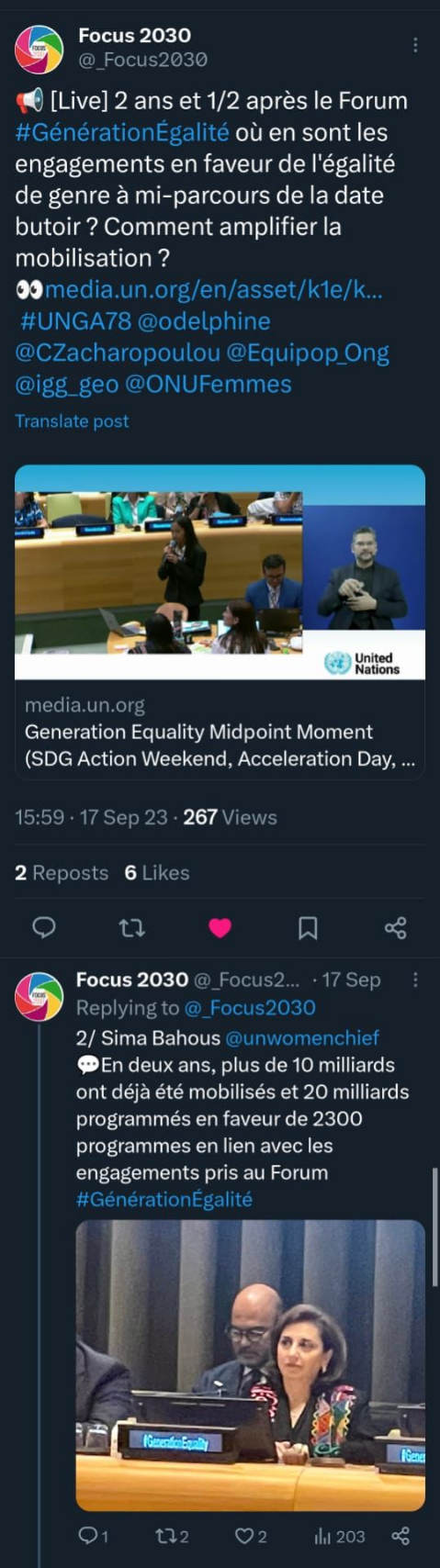 Le 17 septembre 2023, en marge du Sommet sur les Objectifs de développement durable, ONU Femmes, en collaboration avec les gouvernements d’Islande et de Tanzanie, a présenté la revue à mi-parcours de l’initiative "Génération égalité". Cet évènement a réuni plus de 50 représentant·e·s d’États membres des Nations unies, de la société civile et de la jeunesse afin d’évaluer les progrès accomplis, de partager des résultats concrets, de souligner l’importance des initiatives à fort impact, d’encourager des engagements supplémentaires et d’amplifier les efforts au niveau mondial en faveur d’un développement durable respectueux de l’égalité de genre.