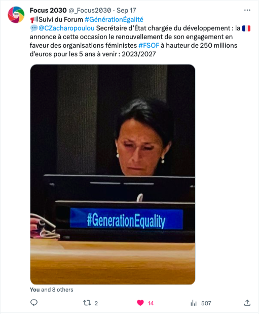 La France, représentée par Chrysoula Zacharopoulou, Secrétaire d’État auprès de la Ministre de l’Europe et des Affaires étrangères chargée du développement, de la francophonie et des partenariats internationaux, a annoncé à cette occasion le renouvellement de son engagement en faveur des organisations féministes à hauteur de 250 millions d’euros pour les cinq ans à venir (2023/2027, soit +25 % par an par rapport à 2020-2022), à travers le Fonds de soutien aux organisations féministes, lancé par la France à l’occasion de sa présidence du G7 en 2019.