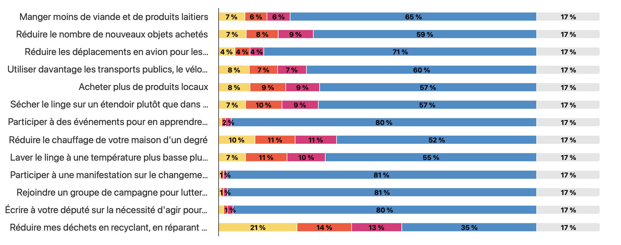 Manger moins de viande et de produits laitiers Réduire le nombre de nouveaux objets achetés Réduire les déplacements en avion pour les vacances ou le travail Utiliser davantage les transports publics, le vélo ou la marche plutôt que la voiture Acheter plus de produits locaux Sécher le linge sur un étendoir plutôt que dans un sèche-linge Participer à des événements pour en apprendre davantage sur la réduction de votre empreinte carbone Réduire le chauffage de votre maison d'un degré Laver le linge à une température plus basse plutôt qu'à une température plus élevée Participer à une manifestation sur le changement climatique Rejoindre un groupe de campagne pour lutter contre le changement climatique Écrire à votre député sur la nécessité d'agir pour réduire les causes du changement climatique Réduire mes déchets en recyclant, en réparant ou en choisissant des produits moins emballés Tout cocher /Tout décocher
