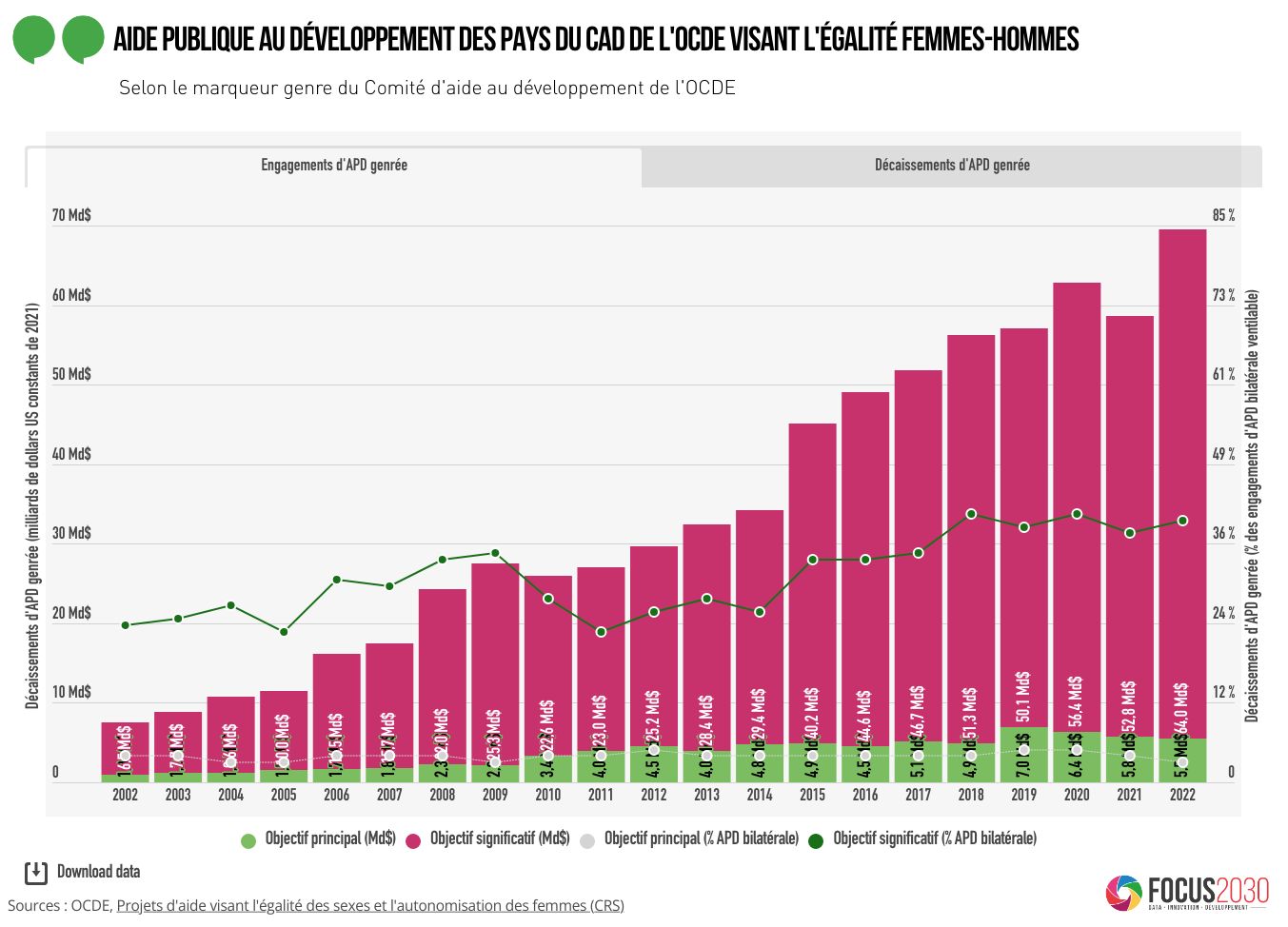 Le suivi de l’aide publique au développement (APD) en faveur de l’égalité est assuré par le CAD de l’OCDE, à l’aide du marqueur de la politique d’aide à l’appui de l’égalité femmes-hommes (voir encadré).