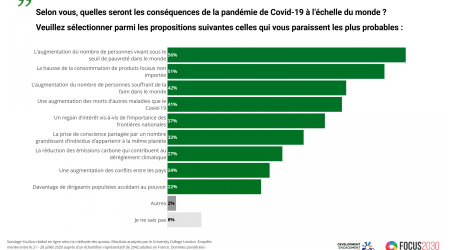 | En partenariat avec l’University College London (UCL) et l’Université de Birmingham, Focus 2030 mène un programme de recherche-action destiné à analyser les perceptions, attitudes, comportements et ressentis des citoyens sur les enjeux de solidarité internationale dans quatre pays : France, Allemagne, États-Unis et Royaume-Uni. Intitulé Development Engagement Lab (DEL), ce projet vise à alimenter en données chiffrées les acteurs du développement (ONG, fondations, think tanks, ministères, institutions publiques, organisations internationales) afin de leur permettre de mieux saisir les attentes citoyennes pour mettre en œuvre leurs activités de communication, de mobilisation et de plaidoyer. C’est dans ce cadre que depuis 2019, des questions récurrentes sont posées tous les ans dans ces quatre pays, parmi lesquelles, cette interrogation permettant de mesurer le degré de connaissance/méconnaissance des Objectifs de développement durable (ODD). |