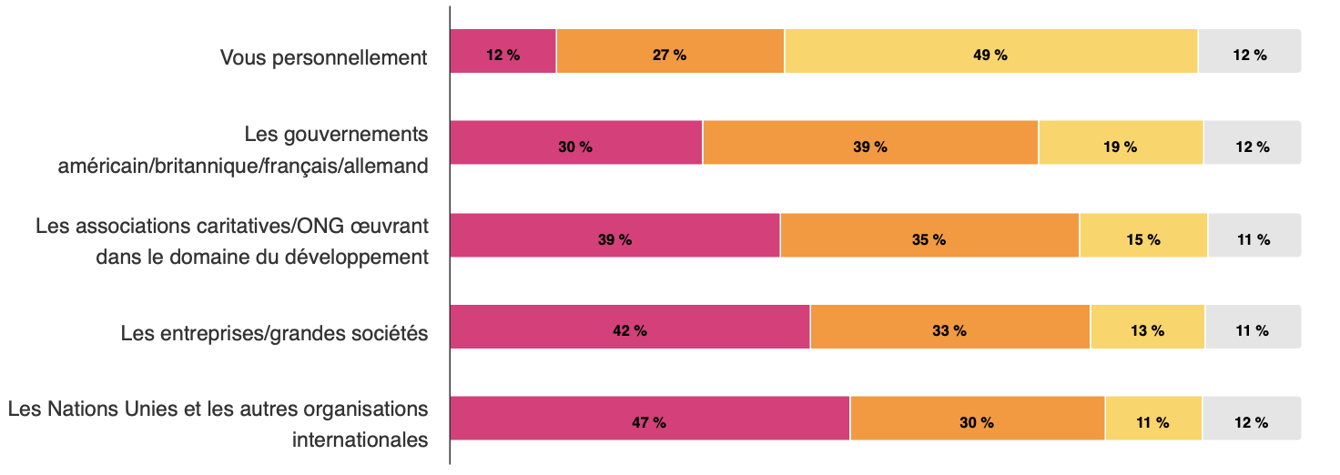 Sondage(s) YouGov réalisé(s) en ligne selon la méthode des quotas. Résultats analysés dans le cadre du projet Development Engagement Lab (2019-2024) par le University College London et l’Université de Birmingham. Données pondérées - Marge d’erreur : ± 2%. Plus d’informations sur la méthodologie sur Focus2030.org - Source : www.developmentcompass.org