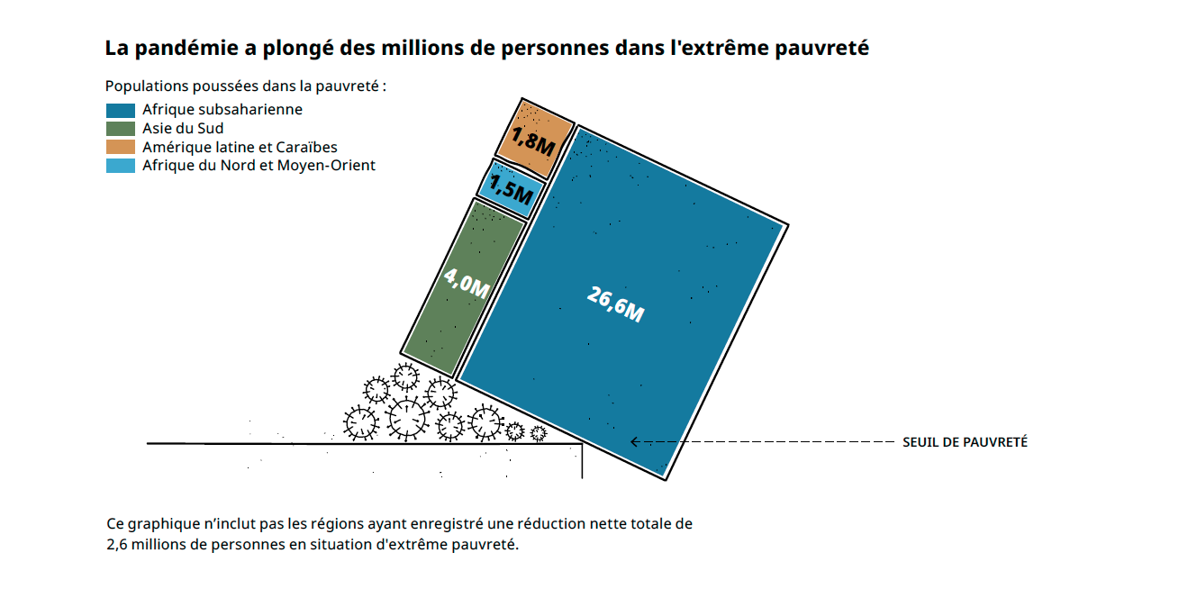 Le rapport souligne que la pandémie de COVID-19 a fait basculer 31 millions de personnes de plus dans une situation d’extrême pauvreté en 2020 par rapport à 2019, et 700 millions de personnes, principalement issues des pays à revenu faible et intermédiaire, devraient demeurer dans une situation d’extrême pauvreté d’ici 2030. Par ailleurs, alors que 90 % des économies avancées retrouveront leur niveau de revenu par habitant pré-pandémique d’ici l’année prochaine, seulement un tiers des économies à faible et moyen revenu devraient connaître un tel rétablissement.