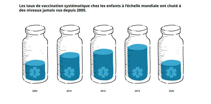 Entre le début de la pandémie et le rétablissement des services de santé au second semestre 2020, plus de 30 millions d’enfants dans le monde n’ont pas été vaccinés, soit 10 millions de plus en raison de la pandémie.