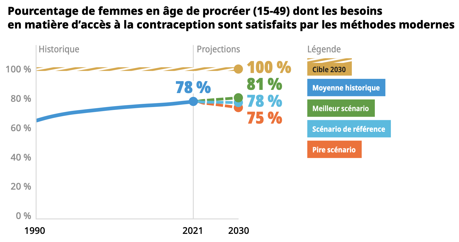 Le constat n’est pas différent pour l’accès à la contraception. En 2021, 78 % des femmes ont vu leurs besoins en contraception satisfaits par des méthodes modernes. Soit, au rythme actuel, la même proportion qu’en 2030, au lieu des 100 % envisagés dans l’Agenda 2030.