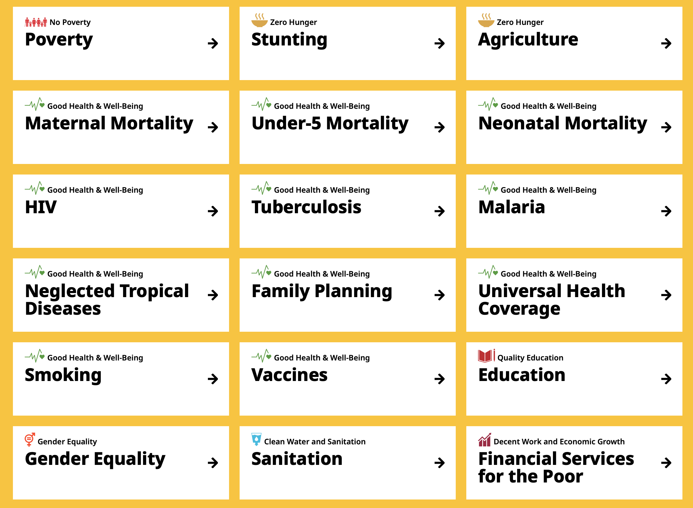 Consultez ces tableaux en version interactive pour 18 indicateurs des ODD 1 à 6 et 8 sur le site de la Fondation Bill & Melinda Gates.