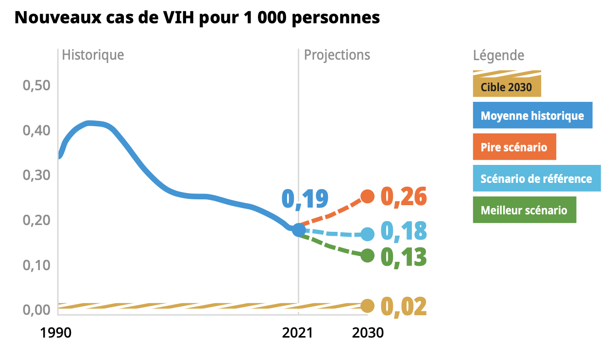 Ainsi, en matière de bonne santé et bien-être (ODD 3), le monde ne parviendra pas, au rythme actuel, à « mettre fin à l’épidémie de sida, à la tuberculose et au paludisme » (extrait de la cible 3.3). Dans le cas de la première, 1,5 million de personnes ont été nouvellement infectées par le VIH en 2021, soit une proportion de 0,19 pour 1 000 personnes. D’après les projections du rapport, elle s’élèvera toujours à 0,18 en 2030, contre les 0,02 visés par l’Agenda 2030.