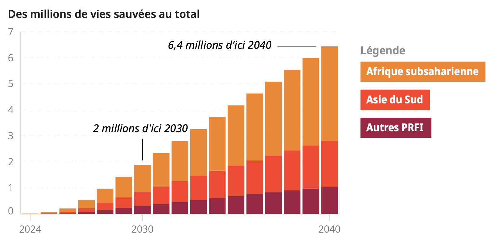 L’ensemble de ces données témoigne d’une situation injuste à laquelle il incombe de remédier pour atteindre les objectifs que la communauté internationale s’est fixés. Ce rapport présente les solutions à mettre en œuvre de manière urgente pour préserver les vies de 2 millions de femmes et d’enfants d’ici à 2030, et 6,4 millions d’ici à 2040.